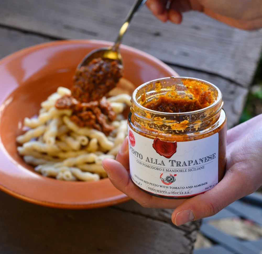 Our Trapanese Pesto is very similar to pistachio and almond pesto. These types of pesto are in fact widely used in Sicily but each area has its own tasty variations. Our Trapani-style pesto has among the main ingredients tomato pulp and concentrate, dried tomatoes, basil, almonds, garlic, oregano, chilli pepper and extra virgin olive oil. The pistachio and almond pesto is instead prepared with pistachio, almonds, extra virgin olive oil, “Cosacavaddu” cheese, sugar, salt, black pepper and nutmeg.