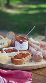 Ibleo Pesto & Bruschetta is produced from a base of dried tomatoes, wild fennel and Sicilian almonds. These ingredients are ground at very low temperatures in order to preserve the natural characteristics and aromas present in fresh products. In the recipe we then add Frantoi Cutrera extra virgin olive oil, sugar, almonds, oregano, chilli pepper. This original pesto has a bright red colour, intense aromatic notes of wild fennel and dried tomato, a dense and creamy consistency alternating with the crunchiness of almonds.