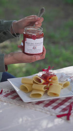 Notre sauce paysanne aux graines de fenouil est obtenue en faisant légèrement sauter des oignons dans de l'huile d'olive extra vierge Frantoi Cutrera. A cela, la sauce tomate et les autres ingrédients sont ajoutés, dont les graines de fenouil sauvage, dans une cocotte-minute pour préserver les caractéristiques organoleptiques de toutes les matières premières. La sauce a une couleur rouge intense, avec des notes aromatiques de tomate, de fenouil et de laurier. La consistance est veloutée.