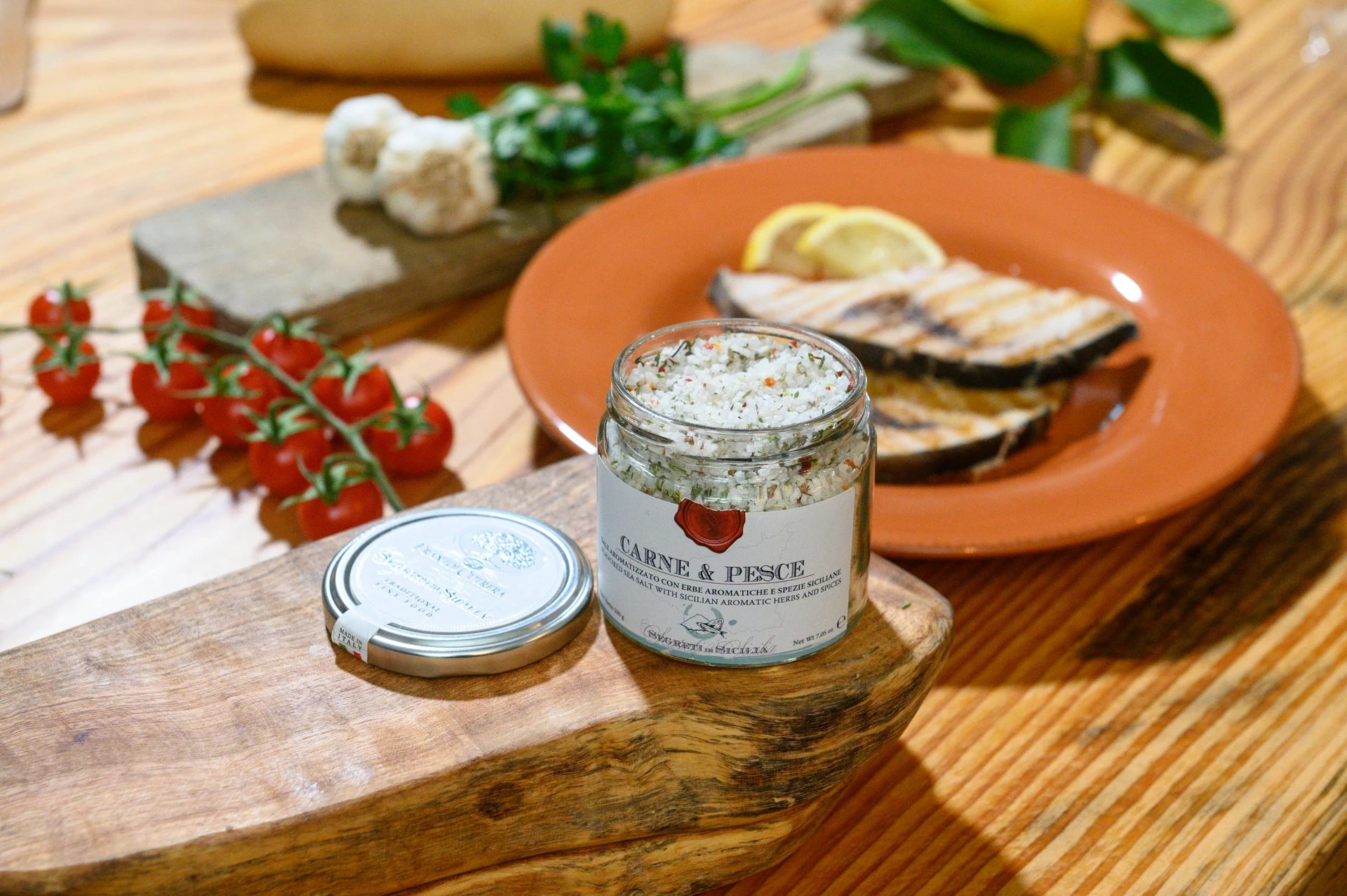 Ce sel provient des salines siciliennes historiques et prestigieuses, celles de Trapani. Il est aromatique et piquant, obtenu en mélangeant des herbes et des épices siciliennes qui poussent spontanément sur les pentes de nos montagnes.
