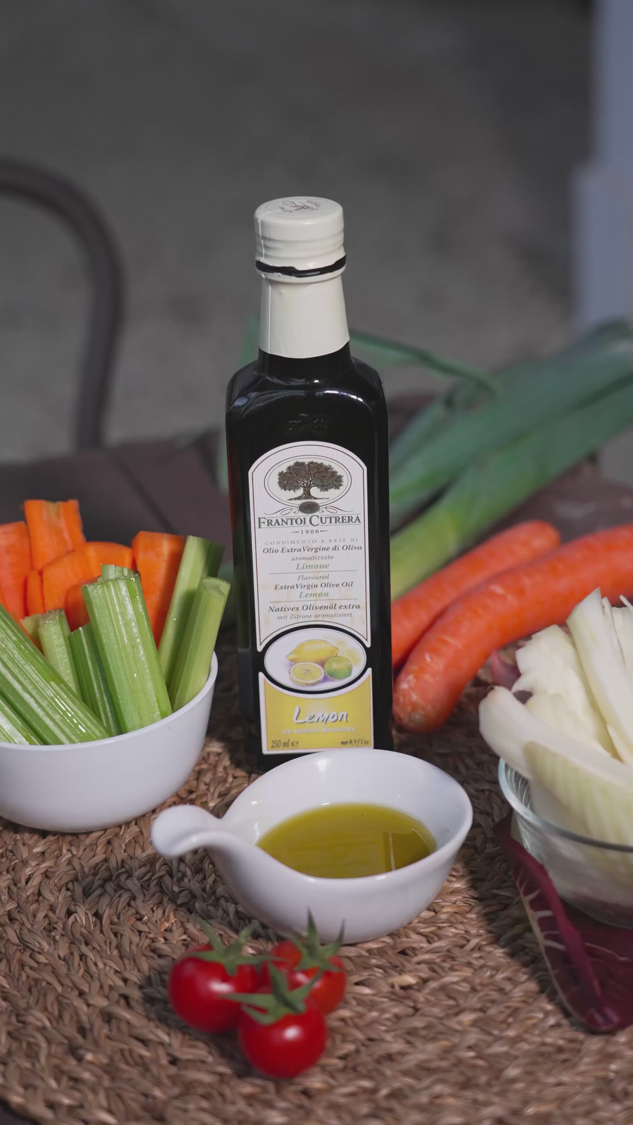 Notre huile d'olive extra vierge Selezione Cutrera est produite à partir de certains des meilleurs cultivars siciliens, récoltés dans le sud-est de la Sicile, entre 200 et 400 mètres d'altitude, dans de jeunes oliveraies situées dans des zones vallonnées et plates proches de la mer Méditerranée. Cet assemblage spécial permet de combiner les différentes caractéristiques organoleptiques provenant de différents cultivars, chacun étant l'expression d'un territoire spécifique. À ce mélange, nous ajoutons l'arôme naturel de citron pour permettre les utilisations les plus variées et les plus imaginatives en cuisine.